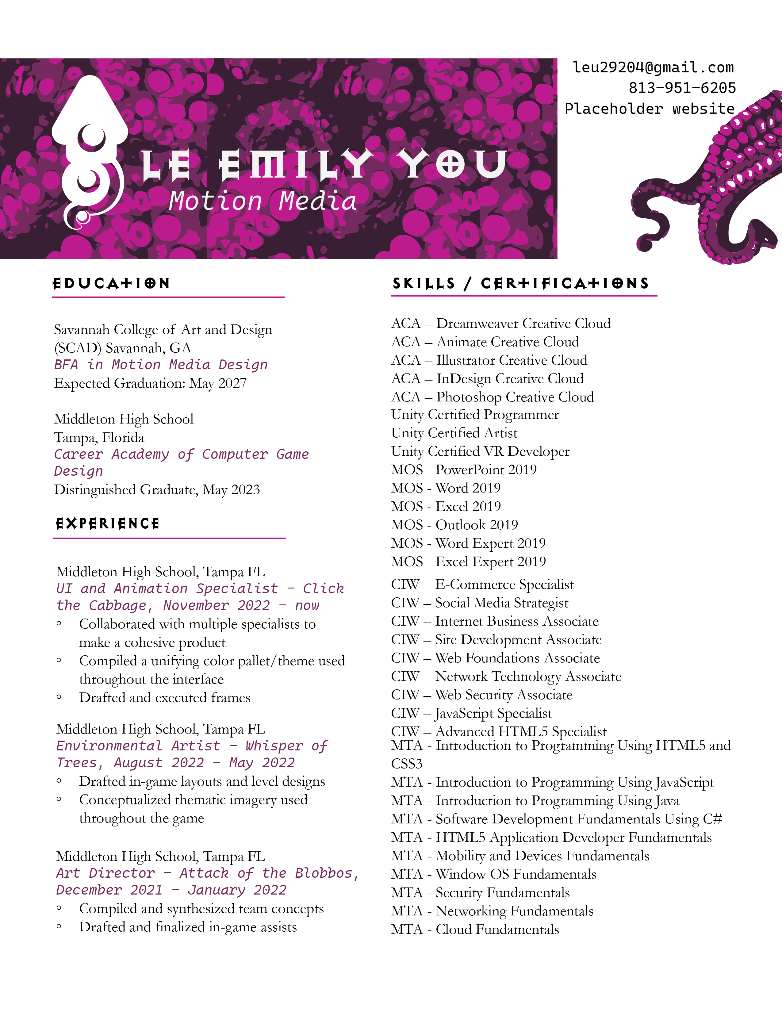 Currently a Motion Media Design major at the Savannah College of Art and Design. Certified in Adobe and the art of coffee addiciton. Supreme burner of the midnight oil and always looking for a challenge.